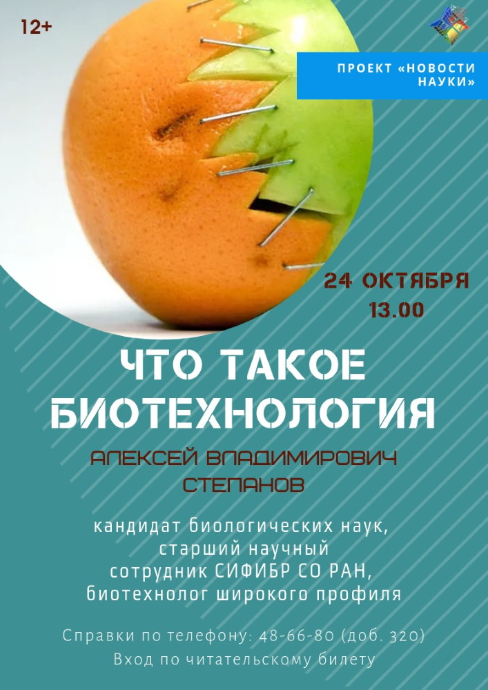 24 октября 2019 в рамках проекта «Новости науки», реализуемого Иркутской областной государственной универсальной научной библиотекой им. И. И. Молчанова-Сибирского, с.н.с., к.б.н. Степанов А.В.выступил перед слушателями с научно-популярной лекцией «Что такое биотехнология». На лекции было рассмотрено много интересных и перспективных направлений современной биотехнологии: от классической биотехнологии растений до молекулярной биотехнологии животных и микроорганизмов. Большинство из описываемых достижений автор применял на практике лично. Слушатели могли познакомиться с материалом, касающимся таких тем, как: получение биологически активных веществ; микроклональное размножение растений; меристемные культуры; безвирусные растения; гаплоидные технологии; гидропоника; аквапоника; вермитехнологии; улиткотерапия; промышленное рыбоводство в установках замкнутого водоснабжения; солнечные вегетариумы и многое другое.