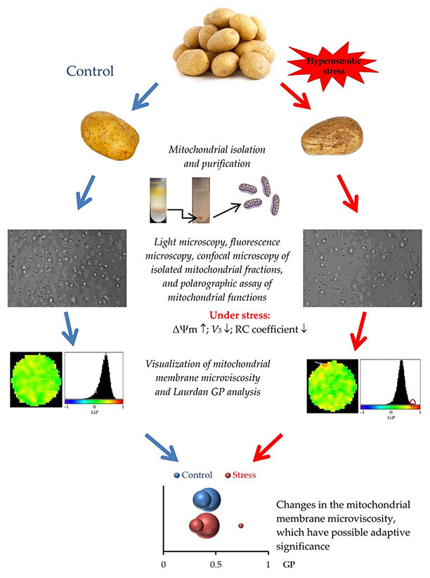 Микровязкость и упорядоченность липидов являются основными параметрами, характеризующими фазовые состояния мембран. Изменения микровязкости и липидного состава в живой клетке могут указывать на серьезные нарушения, включая различные виды стресса. В данной работе исследовалось влияние гиперосмотического стресса на микровязкость митохондриальных мембран на примере митохондрий клубней картофеля (Solanum tuberosum L.). Микровязкость митохондриальных мембран, выделенных из контрольных и подвергнутых стрессу (9 дней при 34–36 °C) клубней, оценивалась путем определения значений генерализованной поляризации с использованием флуоресцентного зонда лаурдан и конфокальной микроскопии. Было выявлено, что распределение генерализованной поляризации в митохондриях, выделенных из подвергнутых стрессу клубней, содержит новую компоненту, характеризующую мембранные микродомены с повышенной липидной упорядоченностью по сравнению с остальной частью мембраны. Мы впервые картировали микровязкость митохондриальных мембран и наблюдали динамику микровязкости мембран отдельных митохондрий. Гиперосмотический стресс существенно влияет на функциональное состояние митохондрий картофеля, снижая скорость окисления субстрата и коэффициент дыхательной регуляции. При гиперосмотическом стрессе изменяется микровязкость митохондриальных мембран и образуются мембранные микродомены с повышенной липидной упорядоченностью. Обнаруженные изменения открывают перспективы для дальнейшего исследования участия рафтоподобных микродоменов митохондрий в устойчивости растений к стрессовым факторам.