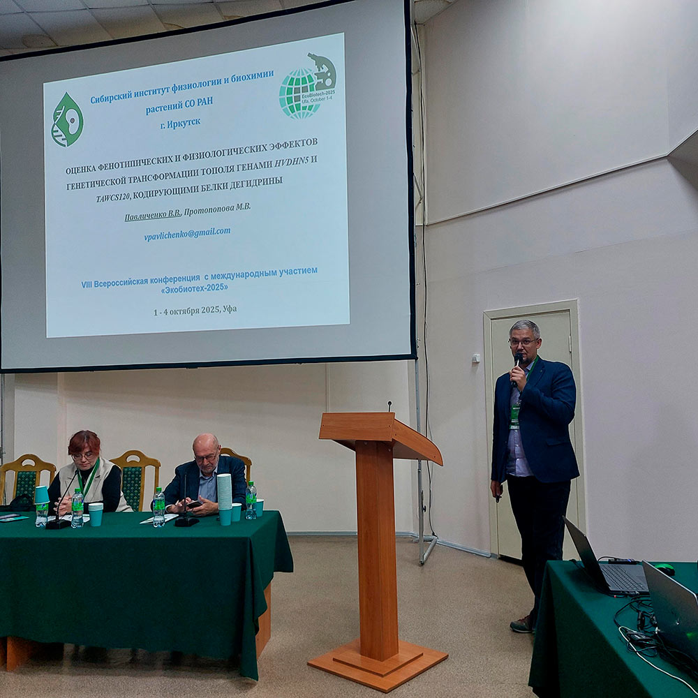Василий Валерьевич Павличенко представил устный доклад «Оценка фенотипических и физиологических эффектов генетической трансформации тополя генами HvDhn5 и TaWCS120, кодирующими белки дегидрины», содержащий основные результаты полученные в ходе реализации проекта РНФ, выполняемого под его руководством.
