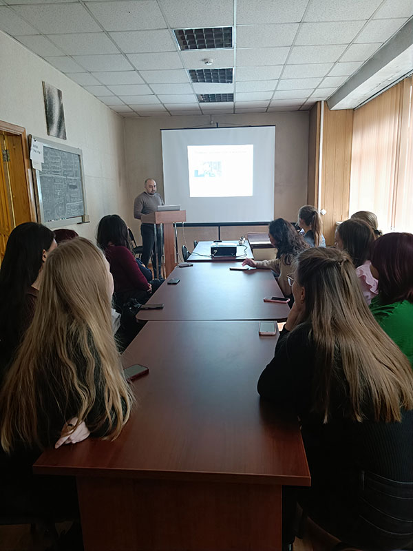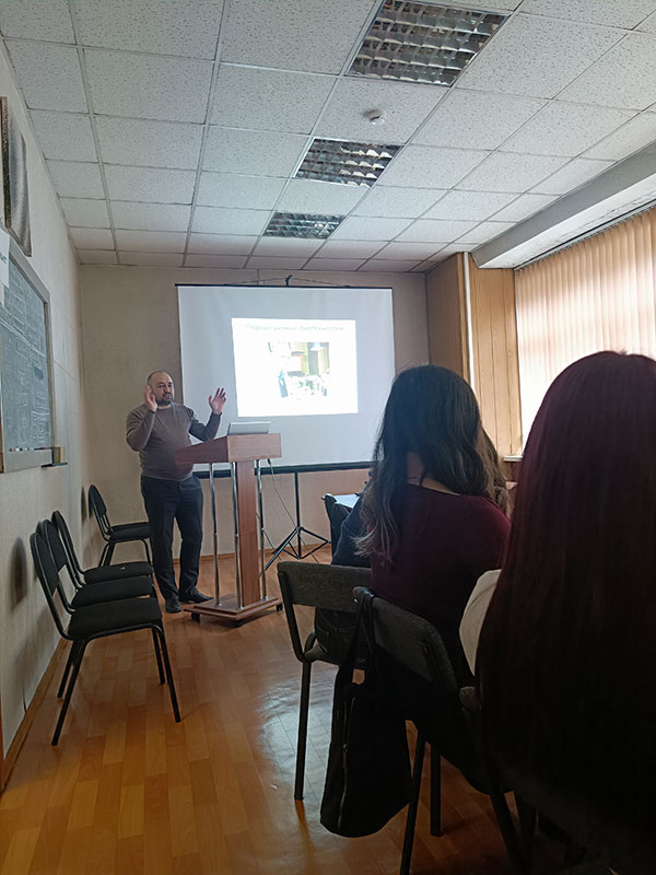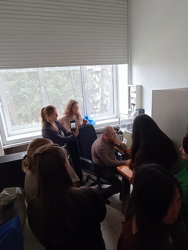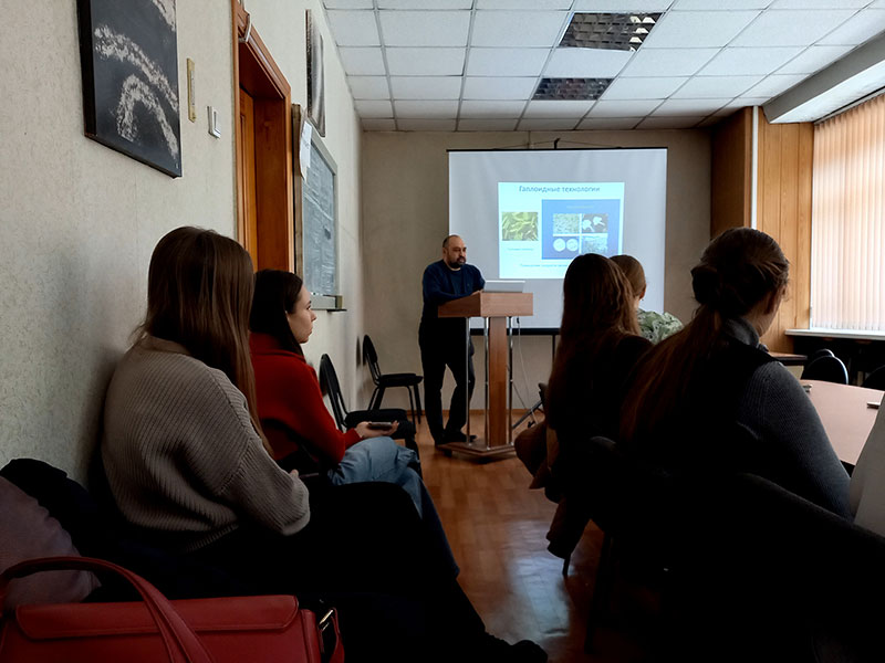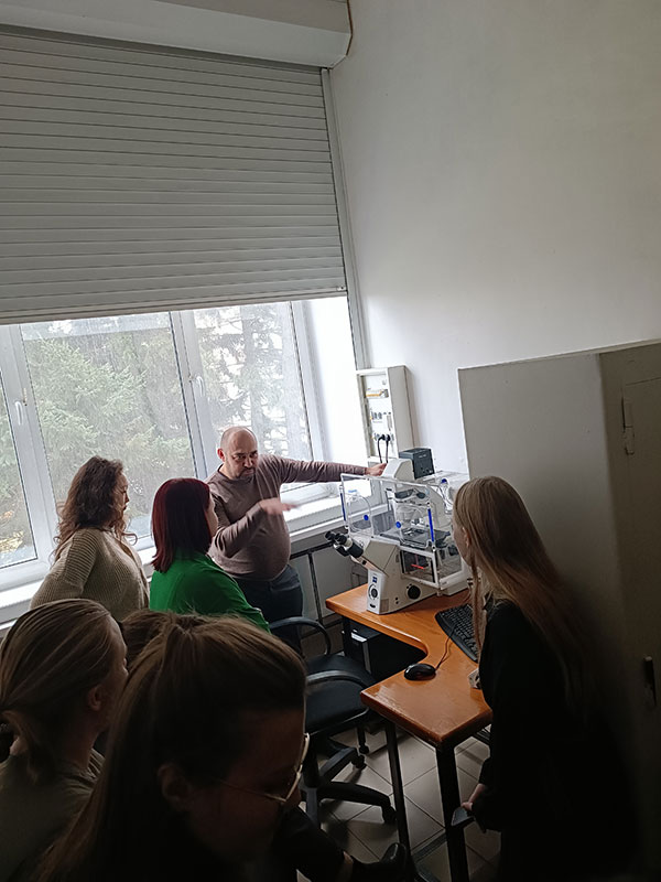 Лекцию на тему «Перспективные направления современной биотехнологии» прочитал с.н.с. лаб. физиологической генетики, к.б.н. Степанов Алексей Владимирович. Он также наглядно познакомил студентов с объектами биотехнологических исследований, такими как растения in vitro (картофель, земляника, малина, шелковица), каллусы тополя, спирулина и продемонстрировал возможности использования флуоресцентного микроскопа для изучения метаболизма клеток и выявления функций митохондрий при стрессах. Зав. лабораторией физиологической генетики, гл.н.с., д.б.н. Грабельных Ольга Ивановна рассказала об основных направлениях работы лаборатории и решаемых задачах. С.н.с., к.б.н. Любушкина Ирина Викторовна познакомила с модельными объектами биотехнологических исследований – суспензионными и каллусными культурами клеток яровой и озимой пшеницы и представила оборудование, которое позволяет выявить физиолого-биохимические и молекулярно-генетические изменения у исследуемых объектов на уровне энергетического обмена, протеома и экспрессии генов. Студентам даже удалось увидеть, как происходит разделение митохондрий в градиенте плотности, и какие условия необходимы, чтобы обеспечить сохранность изолированных органелл, от которых зависит жизнь клеток.