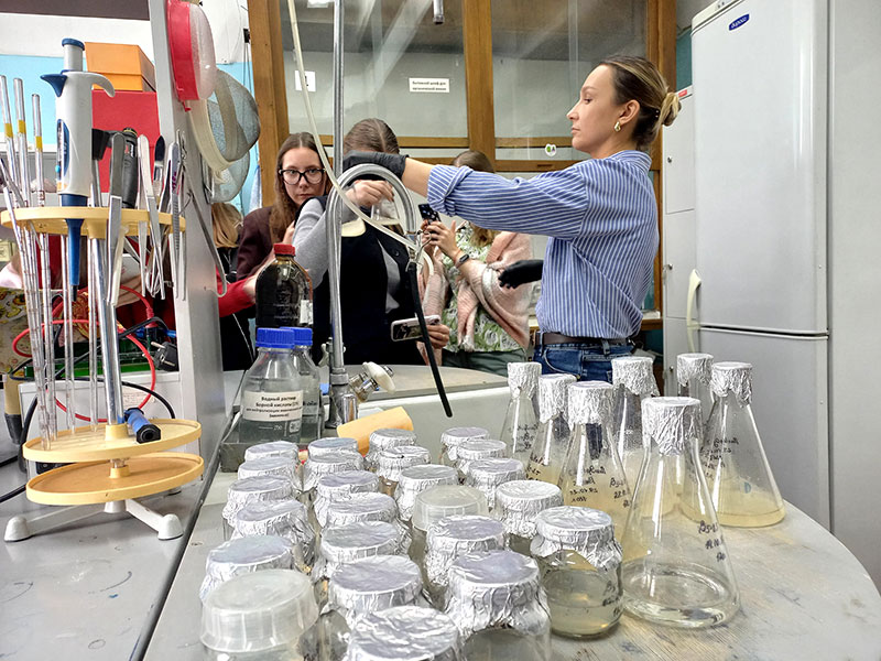 Во время экскурсии в лабораторию природных и антропогенных экосистем с.н.с, к.б.н. Егорова Ирина Николаевна представила научные направления деятельности лаборатории и рассказала об альгологической коллекции водорослей в СИФИБР СО РАН, продемонстрировав наиболее интересные виды, перспективные для целей биотехнологии.